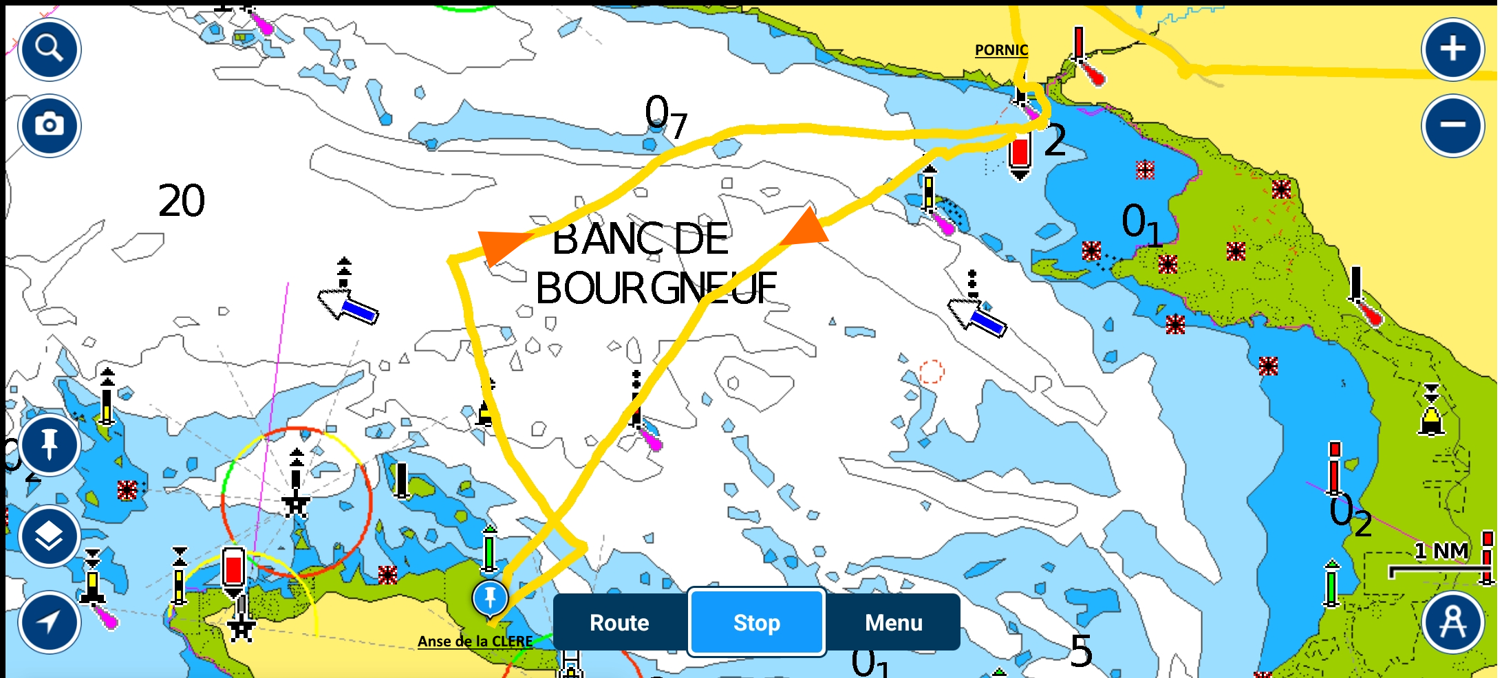 Partis du ponton du port de Pornic, comme prévu à 10h, par un temps disons moyen (bruine en début et fin de sortie) mais un embryon de soleil pour midi , nous avons … mouillé pour déjeuner dans cette anse à l’est de l’Herbaudière.