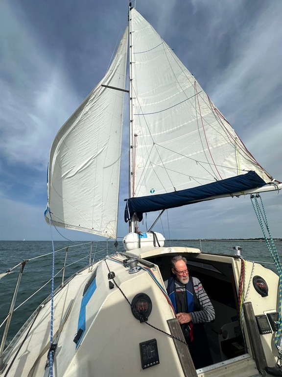 Un ris puis bientôt un deuxième. Nous passons la journée à tirer des bords et passons par le chenal de la Teignouse. Didier se colle à la barre et n’en bouge plus. Il veut apprendre, mais c’est aussi un bon moyen de conjurer l’inquiétude et le mal de mer. Pour ma part, j’alterne le cockpit pour les virements et le carré pour la navigation, et accessoirement j’essuie les fuites d’huile hydraulique du vérin (la voile, ça reste un sport mécanique).